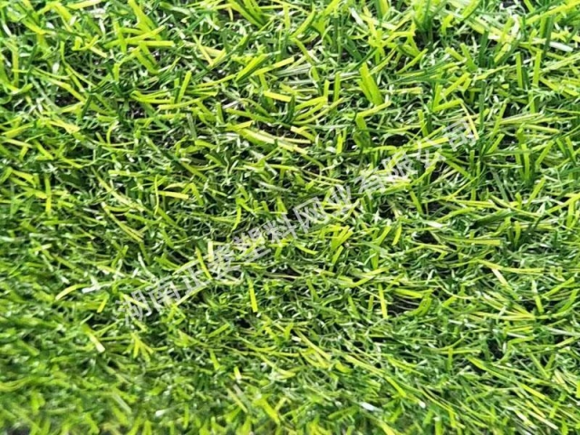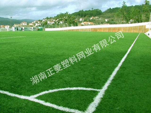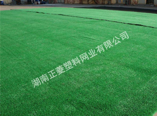 第三層,也是表層,為草皮層。依制造的表面形狀有絨毛草皮、圓環形卷曲狀尼龍絲草皮、葉狀聚丙烯纖維草皮、尼龍絲編制的透水草皮等。這一層也必須用乳膠粘在橡膠或泡沫塑料上。施工時必須全面涂膠,依次壓緊貼牢,不能起皺折。